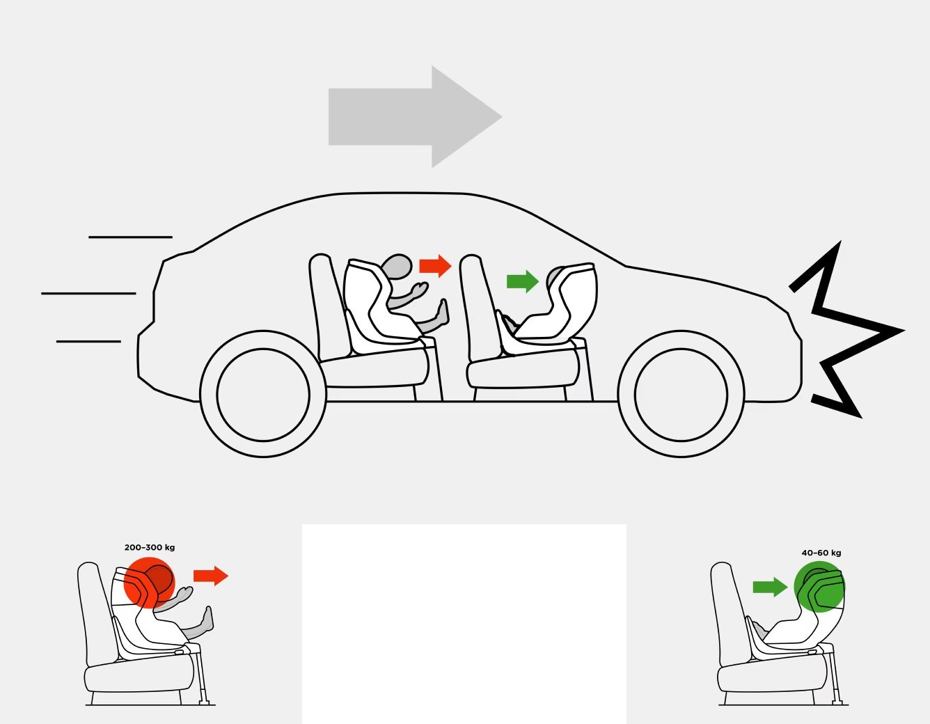 Într-o coliziune frontală, corpul copilului este menținut în loc de centura unui scaun orientat cu fața. Totuși, capul și gâtul sunt proiectate în direcția impactului — fără centură, copilul ar fi aruncat direct din scaun.
