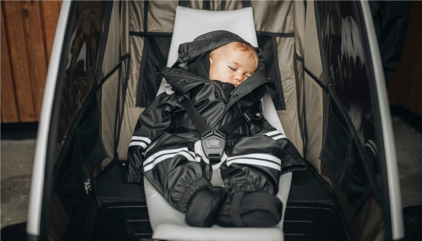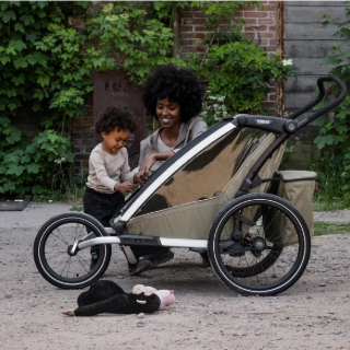Atunci când plimbați copilul cu căruciorul, puneți Thule Chariot Carrier în poziția de șezut înclinată și combinați-l cu Thule Baby Supporter sau Thule Infant Sling pentru a începe plimbarea cu copilul.