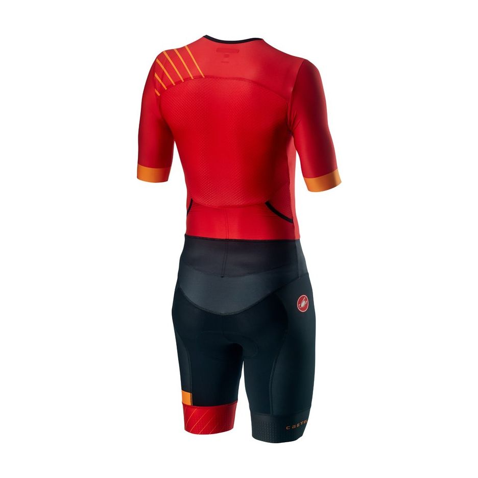 Pana si materialul de pe spate demonstreaza ingineria deosebita in materie de materiale, pe care Castelli o detine. Testele din tunelul de vant certifica avantajul aerodinamic real pe care il ofera acest costum, si pe langa asta, asigura si protectie solata UPF 16. Acest lucru inseamna ca 94% dintre razele UV sunt blocate, oferind un nivel rezonabil de protectie pentru piele, si poate fi folosit cu lotiune de protectie in cazul persoanelor cu piele sensibila. Acest costum ofera un echilibru excelent intre protectie, racire si viteza.