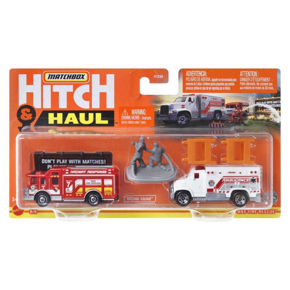 Matchbox hitch&haul set 2 vehicule mbx fire rescue hazard squad mbx ambulance scara 1:64