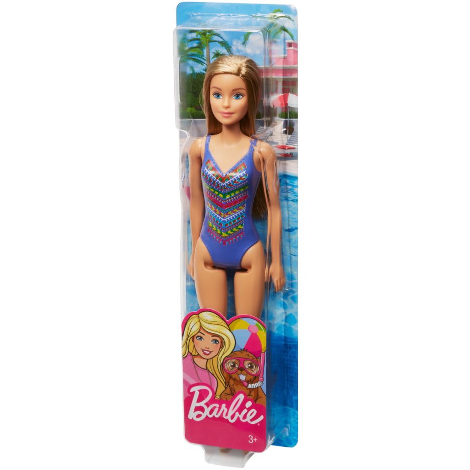 Papusa barbie blonda cu costum de baie cu model multicolor