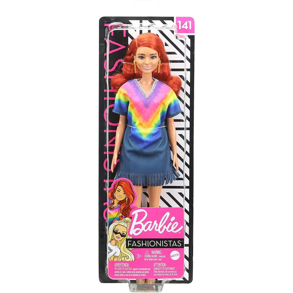 Papusa barbie fashionista roscata cu rochita curcubeu