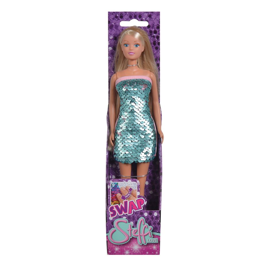 Papusa steffi cu rochie cu paiete albastru deschis