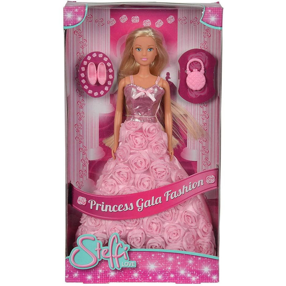Papusa steffi cu rochita roz de gala si plina cu trandafiri