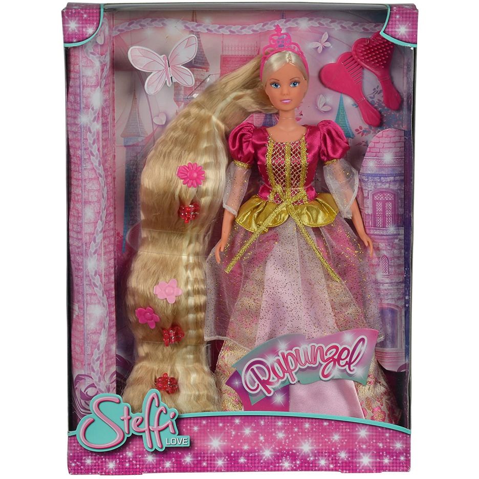 Papusa steffi printesa cu par foarte lung si rochita roz inchis