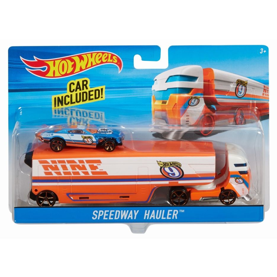 Set camion si masina sport hot wheels speedway hauler
