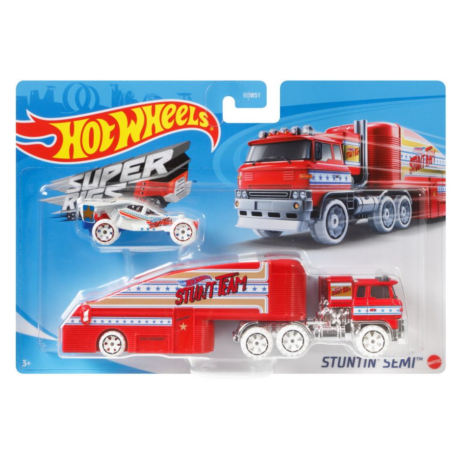 Set camion si masina sport hot wheels white stuntin semi